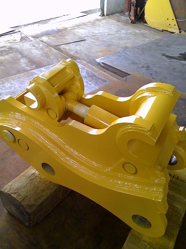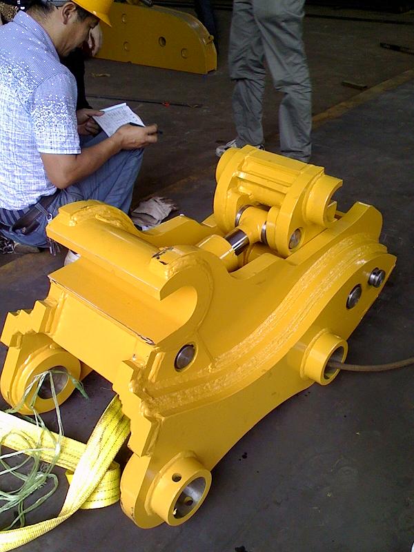 快换接头应用:快换接头能在挖掘机上迅速安装各种配置件(挖斗、破碎锤、液压剪等),能扩大挖掘机使用范围,并能节省时间,提高工效。分为:机械式快换接头、液压式快换接头。机械式用楔子或螺丝定位,液压式用油缸上的单向控制阀定位。液压式需要有一组备用阀,两条软管,还有电磁控制阀。