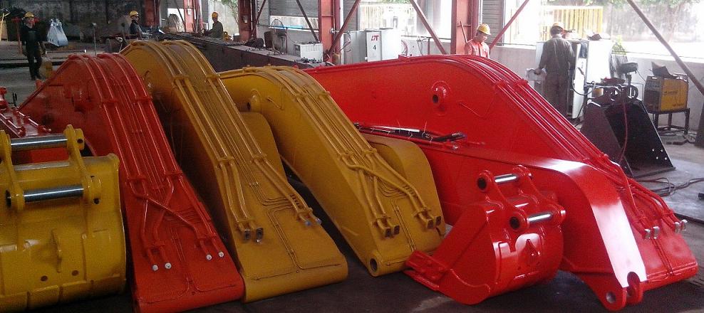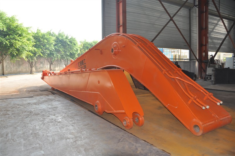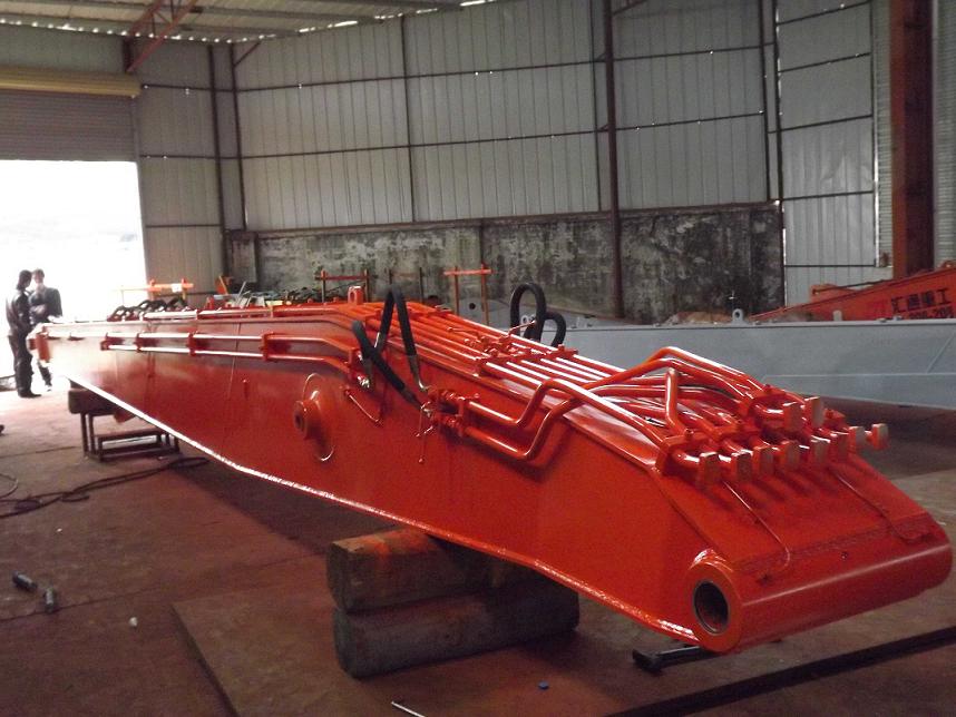 一)、本公司可根据客户施工要求设计生产DH大宇挖掘机加长臂和三段式DH大宇挖掘机加长臂,二段式DH大宇挖掘机加长臂可加长到(13-26)米,二段式DH大宇挖掘机加长臂主要适用于土石方基础和深堑及远距离清淤泥挖掘作业等;三段式DH大宇挖掘机加长臂可加长到(16-32)米,三段式DH大宇挖掘机加长臂主要适用于基坑作业及高层建筑的拆解等。 通过电脑3D辅助设计系统,齐全的加工设备,从应力分析、材质选择、技术和工艺、设计制作等方面保证了挖掘机加长臂的结构强度、使用性能。挖掘机加长臂有内部缓冲板承受张力负载,延长了挖掘机大小臂、挖掘机加长臂的使用寿命。
