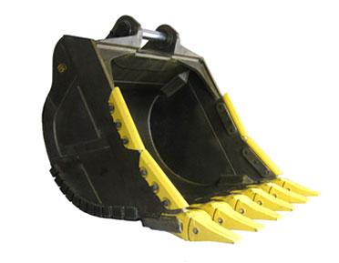 岩石型铲斗:材料选用16MN+高强度耐磨钢NM360及HARDOX400材料,在加强型挖斗的基础上左右加固板,底部加固板齿痤板用边板(侧板)加厚,采用国产优质斗齿座。主要适用于土中混有较硬石块、次坚石、风化石的挖掘;坚石、爆破后的矿石的装载等重作业 。